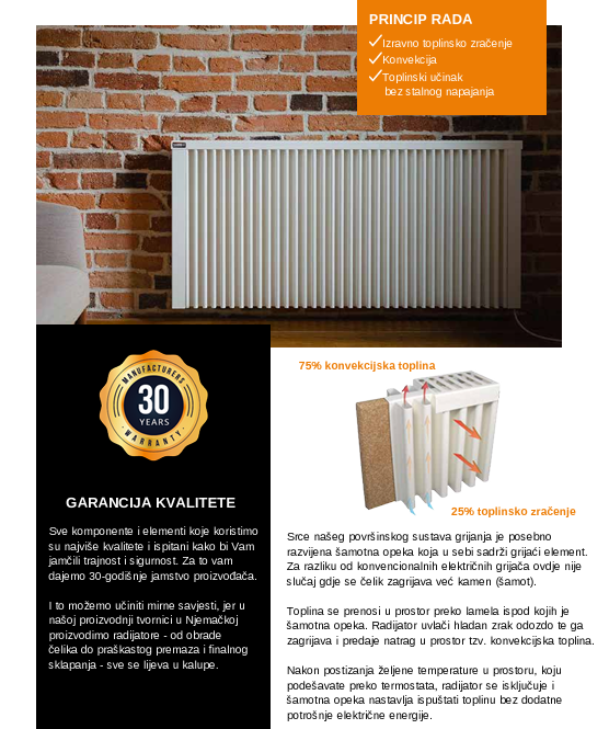 Otkrijte budućnost grijanja s električnim akumulacijskim radijatorima. Električni radijatori s akumulacijskom jezgrom od šamota spajaju prednosti klasičnog akumulacijskog grijanja i izravnog grijanja. Brzo se zagrijavaju i zadržavaju toplinu bez potrebe za prekomjernom potrošnjom električne energije. Osnovni elementi ovdje su šamotna opeka i posebno razvijena rebra. Uz 100% pretvorbu energije i najbolju moguću konvekciju, nude ne samo maksimalnu učinkovitost već i ravnomjernu raspodjelu topline – idealno za osobe koje pate od alergija. I što je najbolje od svega, ne morate brinuti o dodatnim troškovima zbog održavanja ili dimnjačara kao kod ostalih sustava grijanja. Električni akumulacijski radijatori su isplativa zamjena za zastarjele noćne akumulacijske radijatore i dolaze s impresivnim 30-godišnjim jamstvom proizvođača. Prilagođene kontrole omogućuju Vam da električni radijator prilagodite svojim potrebama. Osim toga, naši se električni grijači besprijekorno integriraju s foto naponskim sustavima te rade tiho i bez mirisa. Pouzdajte se u kvalitetu “Made in Germany” i iskusite jednostavnu instalaciju kao i jednostavno spajanje. Svaki radijator dolazi sa na sebi ugrađenim termostatom, priključnim kabelom od 1.5 [m] i utikačem (230 V) te dodatno dolaze zidni nosači. Grijanje našim električnim radijatorima je pametno, učinkovito i ekološki prihvatljivo. Nabavite naše električne akumulacijske radijatore danas i doživite udobnost na novoj razini.